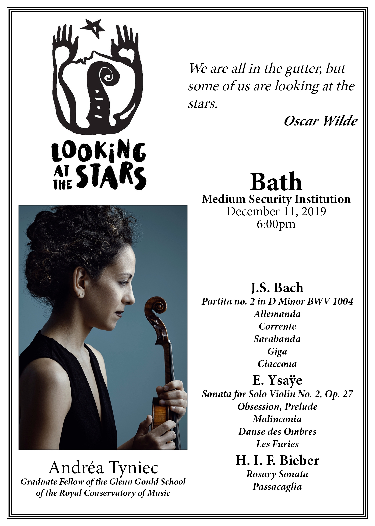 “I am honored to support Looking at the Stars and its wonderful and important work with my performance at Pacific Institution Regional Treatment Centre. By performing works by Bach and Weinberg in the circumstances and surroundings of a prison, I will do my small part to bring humanity and art into the inmates’ everyday life. I am sure it will be a unique and special performance for me and hopefully an inspiring event for the audience,” said violinist, Gidon Kremer.