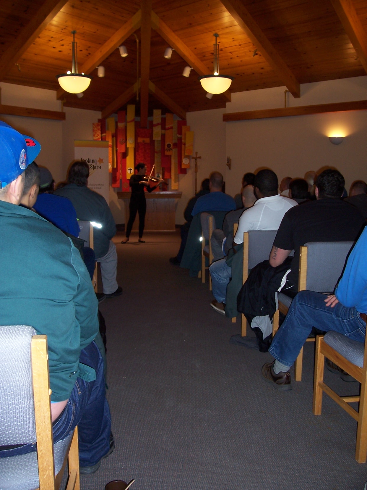 The men who were present fully compensated for the aforementioned shortcomings by bestowing a cordial, enthusiastic reception on the soloist, Andrea Tyniec. Andrea again (as was the case at Grand Valley Institution for Women earlier this year) offered a program which presented a well-prepared narrative of dramatic moments in her life intertwined with the works of “alternative” composers, such as Biber, Corigliano, and Sokolovic – a musical equivalent of the same personal narrative, but retold by the violin. Her deeply personal message to the inmates was reciprocated with highly emotional and immediate feedback from the inmates. An excerpts from Les Miserables were read by Dmitri – not a great job on the greatest masterpiece of Victor Hugo, but listened to attentively nonetheless. The numerous testimonials and letters we received subsequently speak to the power and impact of Andrea’s ability to connect to the broad audience and touch their hearts and souls. The inmates letters speak for themselves: